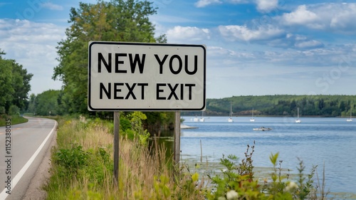 "New You Next Exit" Sign by a Serene Waterfront Road