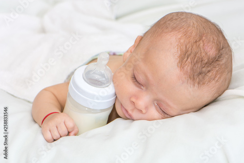 newborn baby curled up sleeping on a blanket with feeding bottle