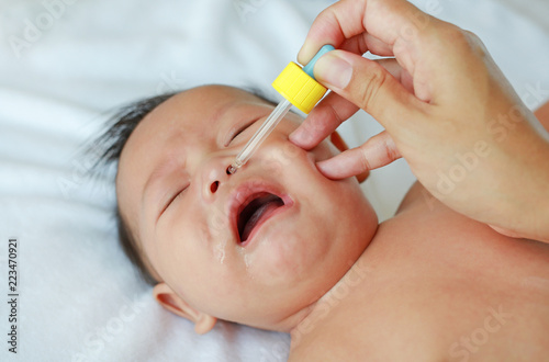 Newborn baby gets nose drops. Baby care concept.