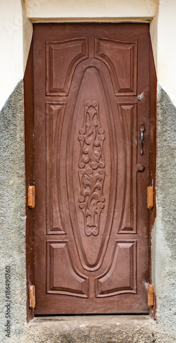 Newly painted brown door on white wall