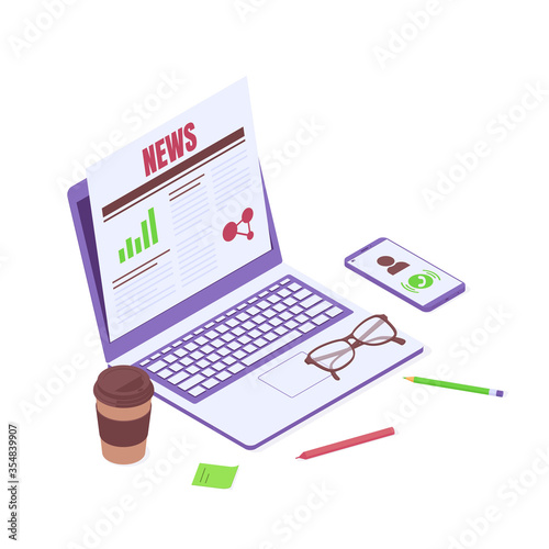 News reading isometric vector illustration - newspaper with economic or financial article on screen of laptop.