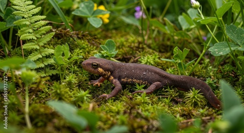 Newt in its Natural Habitat Surrounded by Lush Greenery and Wildflowers
