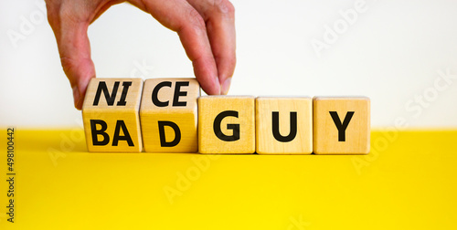 Nice or bad guy symbol. Businessman turns cubes and changes concept words Bad guy to Nice guy. Beautiful white background. Business psychological nice or bad guy concept. Copy space.