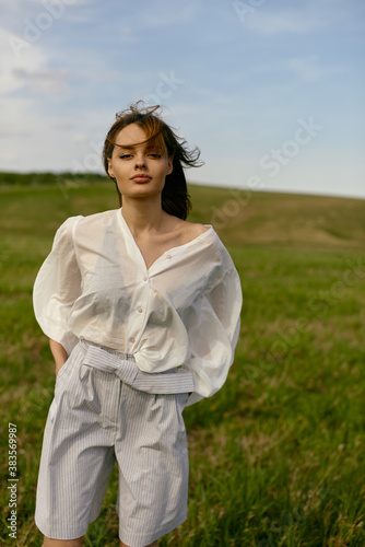 Nice picnic on the grass. Young beautiful woman in the middle of green field. Summer landscape, good weather. Windy day with sun and clouds. Cotton white suit eco style.