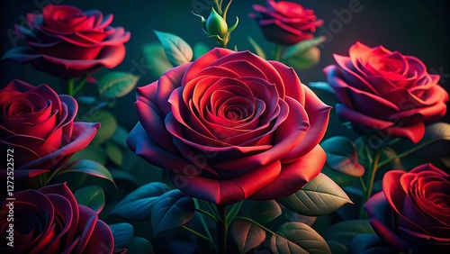 Night Blooming Red Roses Close-Up - Vibrant Petals & Lush Green Leaves