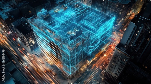 Night city building overlay blueprint, aerial view
