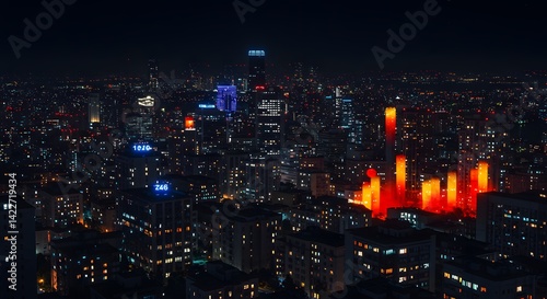 Night Cityscape Aerial View: Illuminated Buildings and Urban Glow at Night