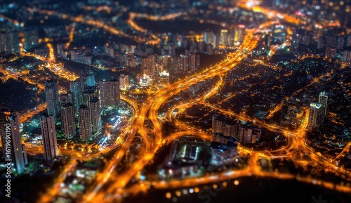 Night cityscape, aerial view, illuminated roads and buildings