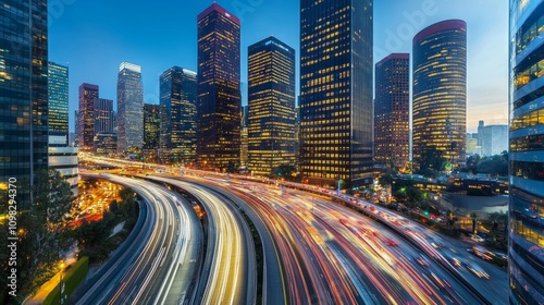 Night cityscape with highway traffic light trails.