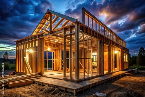 Night Construction: Unfinished Wood Frame House with Electrical Wiring