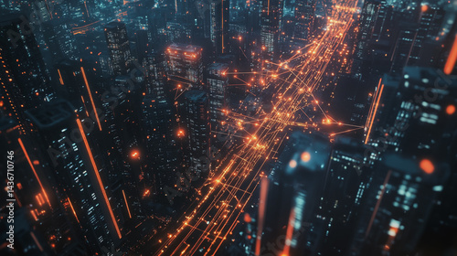 Night lights, a city of modern business and smart digital innovation with a network of interconnected rewards over the cityscape of the future smart wireless digital city and social media network that