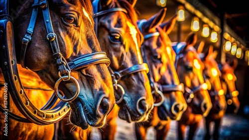 Night Photography: Gleaming Horse Bits, Equestrian Equipment, Dark Background