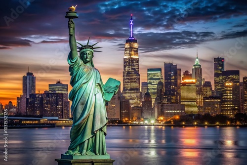 Night Photography of Statue Liberty with Manhattan Skyline on a Clear Day
