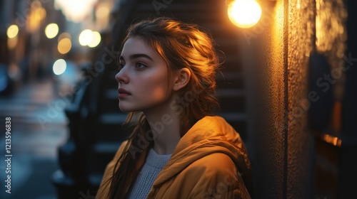 Night portrait of a pensive young woman in an urban setting, illuminated by warm streetlights. A moment of quiet contemplation.