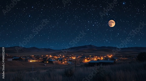 Night scene of a small town illuminated under a starry sky and full moon.