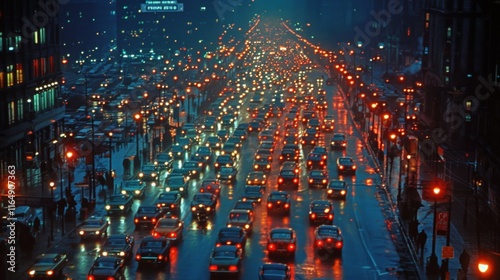 Night traffic jam on a city street, viewed from above, showing numerous vehicles with headlights illuminated.