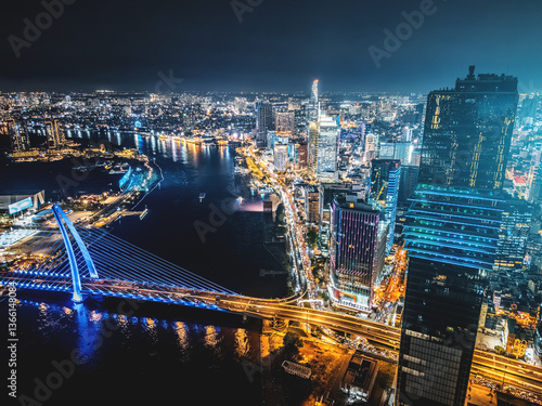 night view of illuminated Ho Chi Minh city skyline and Saigon river, neon street lights of financial downtown district with tall skyscraper towers, Vietnam aerial drone view