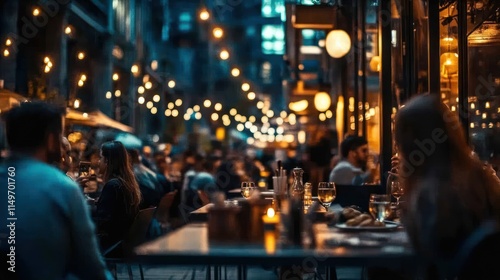 Nightlife at a bustling outdoor restaurant, warm lighting, people dining.