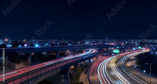 Nighttime Highway Interchange with Light Trails Over Cityscape