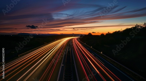 Nighttime long exposure of a road. A vibrant long exposure shot capturing the dynamic lights of cars traversing a road at night, reflecting the urban pulse