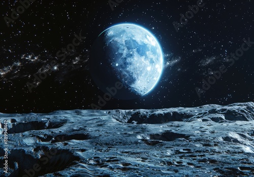 Nighttime View of a Cratered Moon Landscape