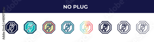 no plug icon in 8 styles. line, filled, glyph, thin outline, colorful, stroke and gradient styles, no plug vector sign. symbol, logo illustration. different style icons set.