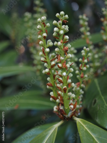 Noch nicht geöffneter Blütenstand der Kirschlorbeere bzw. Prunus laurocerasus