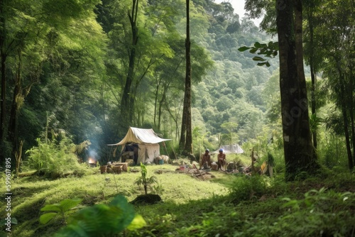 nomadic tribe setting up camp in lush green forest, created with generative ai