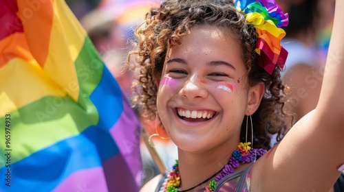 Non-binary person smiling and waving a rainbow flag at a Pride rally