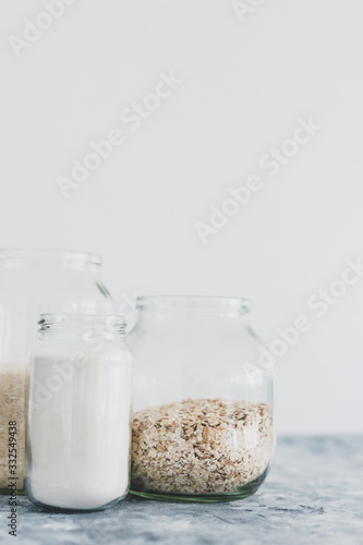 non-perishable food ingredients for vegan pantry, glass jars with oats flour and rice