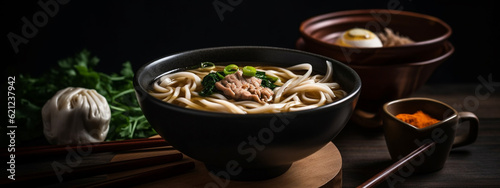 noodles on a black background. Generative AI