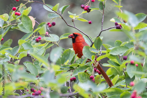 northern cardinal (Cardinalis cardinalis) eating juneberry