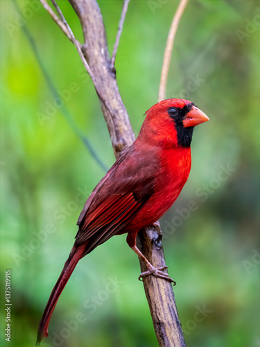 Northern Cardinal (Cardinalis cardinalis), perched on a slender branch against a lush, green, out-of-focus background