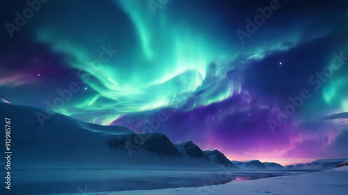 Northern lights against the backdrop of snow-capped mountains. Winter magical landscape. AI