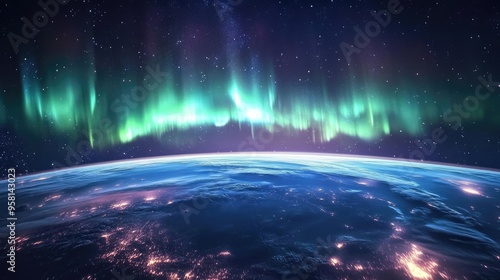 Northern Lights, Aurora Borealis, shimmering above Earth's horizon, a breathtaking display of nature's beauty seen from space
