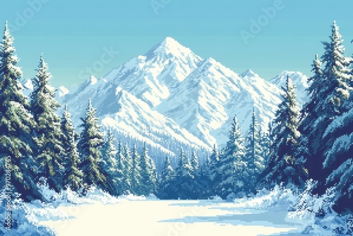Nostalgic Pixelated Mountain Landscape with Snowy Pines and Clear Sky for Text Overlay
