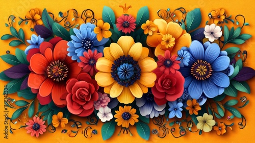Nowruz greeting card design with Persian motifs and colorful flowers