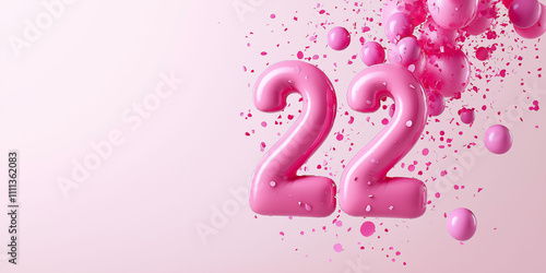 Number 22 with pink confetti and spheres, birthday or anniversary celebration decorations
