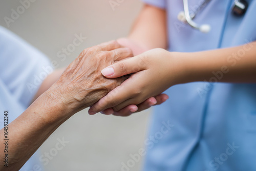 Nurse hand and senior patient hand in empathy, safety and care concept