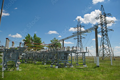 Nur-Sultan, Kazakhstan - 05.28.2015 : High-voltage power lines with insulators, stabilizers and transformers.