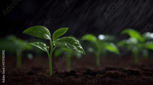 Nurturing Life: A Tender Sprout in the Rain: A close-up shot of a tender sprout thrives in the nurturing embrace of the rain, symbolizing growth, resilience, and the delicate beauty of nature.