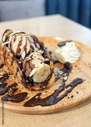 Nutella Puff Parfait banana with chocolate on wooden tray