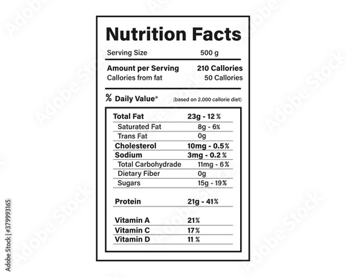 Nutrition Facts Label. Information about ingredients. Percentage from daily value. Calories, Fat and Vitamins in food.