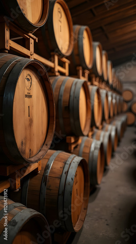 Oak barrels for wine or cognac storage, neatly stacked in a cool cellar of a distillery. Traditional production of craft beer or brandy. Winery and winemaking process. Wine aging in barrels. Ideal bac