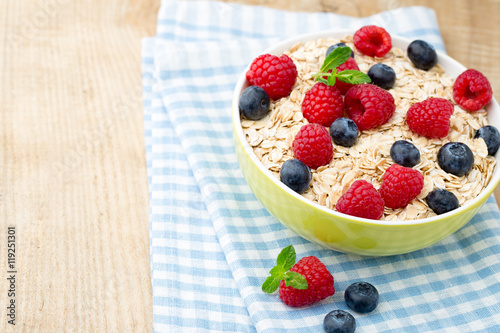 Oatmeal porridge with berries. Raspberries and blueberries.