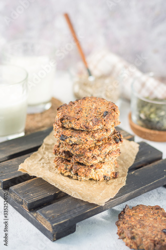 Oatmeal raisin on paper and a wooden stand with milk in the background