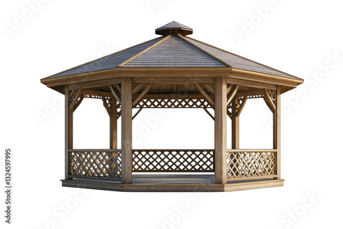 Octagonal wooden gazebo pavilion with lattice railing isolated on Transparent Background