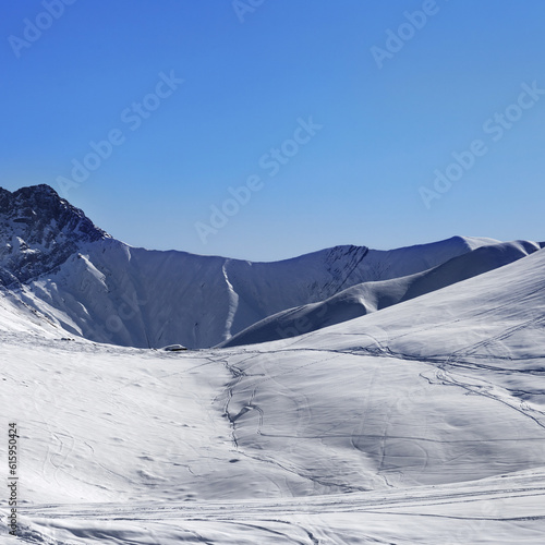 Off piste slope at nice sun morning. Georgia, region Gudauri in winter. Caucasus Mountains.