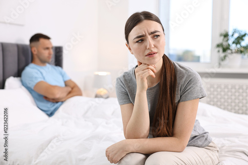 Offended couple ignoring each other in bedroom, selective focus