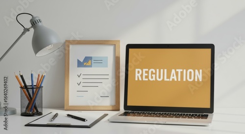Office desk setup displaying the word 'Regulation' on a laptop screen